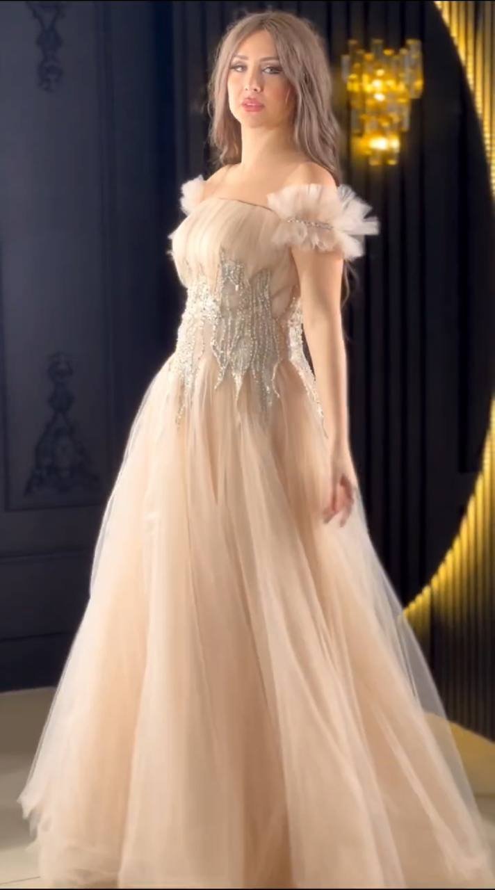 فستان طويل من قماش التول الناعم باللون البيج